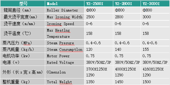 1、YZ系列燙平機(jī)采用蒸汽加熱方式,傳動(dòng)采用調(diào)速電機(jī),根據(jù)加熱溫度和布革厚度隨